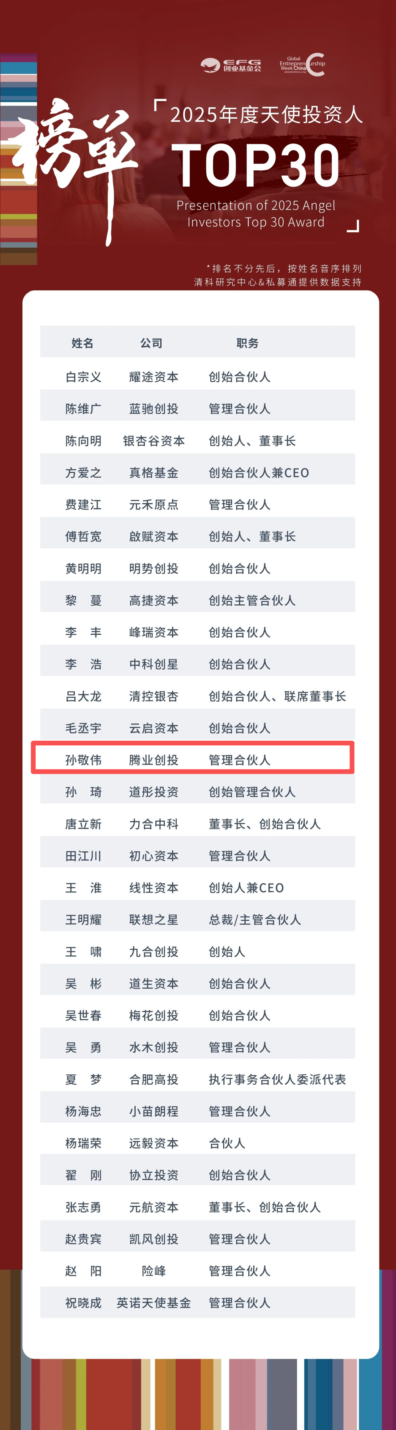腾业创投管理合伙人孙敬伟先生荣膺2025年度“中国天使投资人TOP30”